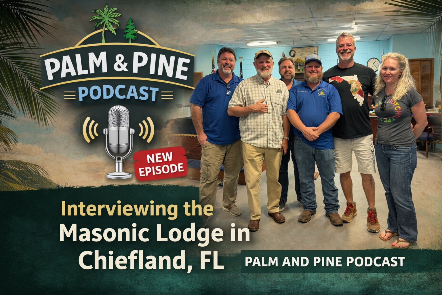Our YouTube videos! Give us a CRYPTO TIP! NEW! 10 Mar. 2026 (77). Inside the Masonic Lodge: Secrets, History and Truth About Freemasonry, Brown Lodge No. 51 in Chiefland, Florida. On this special episode of the Palm and Pine Podcast, the boys of Old Florida receive a rare invitation inside a real Masonic Lodge. We travel to the small North Florida town of Chiefland to sit down with the leadership of Brown Lodge No. 51 F&AM and learn firsthand about one of the most talked about and most misunderstood fraternities in the world: Freemasonry. For centuries, the Masons have been surrounded by rumors, myths, and conspiracy theories. Are they secret rulers of the world? A mysterious cult? Or, something more ordinary? 27 Feb. 2026 (76). Scotland to Scotty's: Old Florida Roots, Raw Boar Chaos and Daytona Beach Boardwalk Madness. On this episode of The Palm and Pine Podcast, the boys of Old Florida trace their rugged Scottish heritage and the pioneer spirit that helped shape the Sunshine State. From Highland grit to cracker cattle country, we explore how Scottish roots run deeper in Florida than most folks realize. And, before the orange aprons of The Home Depot ever rolled into town, real Florida men shopped at the legendary, long forgotten big box hardware empire, Scotty's. If you grew up in Florida, you remember the jingle, the smell of lumber, and the feeling that Scotty's was practically a rite of passage. 19 Feb. 2026 (75). AI vs. Old Florida: Armed Dads, Armed Sons & a Counterfeit Valentine. Today on the Palm and Pine Podcast, the boys of Old Florida dive headfirst into the AI revolution and whether artificial intelligence can ever truly understand real Florida living. Between swapping classic Old Florida stories and tackling the future of tech, the conversation turns to one of the Sunshine State's most unspoken truths, the sacred Florida dad-and-son code. In Florida, mutual respect isn't just taught, it's understood, especially when both parties are well armed and well prepared. But in this week's Florida Man News, one father and son duo took that unwritten rule way too far. 17 Feb. 2026 (74). Real Florida Man Doesn't Go to the Beach? Pickleball Brawl plus Stephen Foster Classic Think every Florida man lives at the beach? Think again. On this episode of the Palm and Pine Podcast, the boys of Old Florida bust one of the biggest myths about the Sunshine State: most real Florida folks rarely see the beach, and some have never laid eyes on the ocean. From cattle pastures and pine flats to fish camps and backwoods riverbanks, this is the Florida tourists never post about. And because no episode is complete without honoring old Florida roots, the boys perform the classic "Old Folks at Home" by Stephen Foster, a song deeply tied to Florida history and the Suwannee River tradition. 12 Feb. 2026 (73). Bartram, the Great White Chief and Florida's Original Caffeine: Brewing Yaupon Tea On today's episode of the Palm and Pine Podcast, the boys of Old Florida retrace the legendary travels of naturalist William Bartram through Levy County, revisiting his historic meeting with the Great White Chief at the Seminole trading hub of Talahasochtee. Along the way, the conversation turns to one of Florida's most fascinating and forgotten traditions: Yaupon holly tea, also known as ceremonial black drink. The boys walk you step by step through how to brew your own Yaupon tea, the only naturally caffeinated plant native to North America and once the original energy drink of Old Florida. 10 Feb. 2026 (72). Lawnmowers, Love Affairs and Florida Man Gone Wild on the Palm and Pine Podcast Today on the Palm and Pine Podcast, the boys of old Florida tackle the most sacred tool every real Florida man owns: the lawnmower. It's a true love-hate relationship down here, when you can mow year round but somehow only manage to cut sand, weeds, and pure frustration. Then it's time for Florida Man News, and things go completely off the rails. One Florida man finds himself dating a knife-throwing Florida woman (because of course he does), while another Florida man takes romance to an entirely new level... with a vacuum cleaner. Yes. That really happened. 31 Jan. 2026 (71). From Army Days to Florida Man Dating Chaos. On this episode of the Palm and Pine Podcast, the boys of Old Florida kick things off with legendary tall tales from classic Florida and unforgettable stories from their time in the U.S. Army, full of grit, humor, and the kind of memories you only earn the hard way. Then, things take a sharp turn into Florida Man madness, featuring one of the wildest dating app disasters yet, a match that goes downhill fast, and ends in peak Florida Man chaos. 27 Jan. 2026 (70). Florida Man Gone Wild: Cocaine Grouper, Stolen Stanley Cup & Legendary Tall Tales In this wild Florida packed episode of the Palm and Pine Podcast, the boys of Old Florida dive headfirst into legendary Florida tall tales, outrageous Florida Man news, and the kind of chaos you can only find in the Sunshine State. From catching a mess of square grouper (aka cocaine fish) to a stolen Stanley Cup caper, this episode covers the most unbelievable, hilarious, and downright insane Florida stories making headlines. 24 Jan. 2026 (69). Cousin Russ on Gators Football & Wild Florida Man News On this wild and wide open episode of the Palm and Pine Podcast, the boys of Old Florida welcome Cousin Russ for a jam packed conversation on the future of green energy in Florida, the rapid expansion of data centers across the Sunshine State, and what it means for Florida's environment, economy, and communities. Wait for it! The boys sing the old time spiritual "Power in the Blood" to conclude the episode! 13 Jan. 2026 (68). New Blues, New Year, Same Wild Florida New year, new blues. The Palm and Pine crew drops their latest blues track, "Susie Wong's Asian Massage," and then dives headfirst into the first major Florida headlines of 2026. From cultural oddities to stories only Florida c
